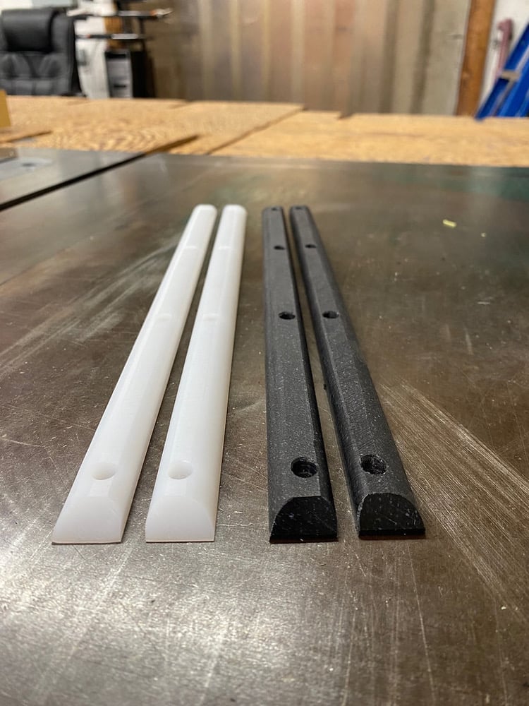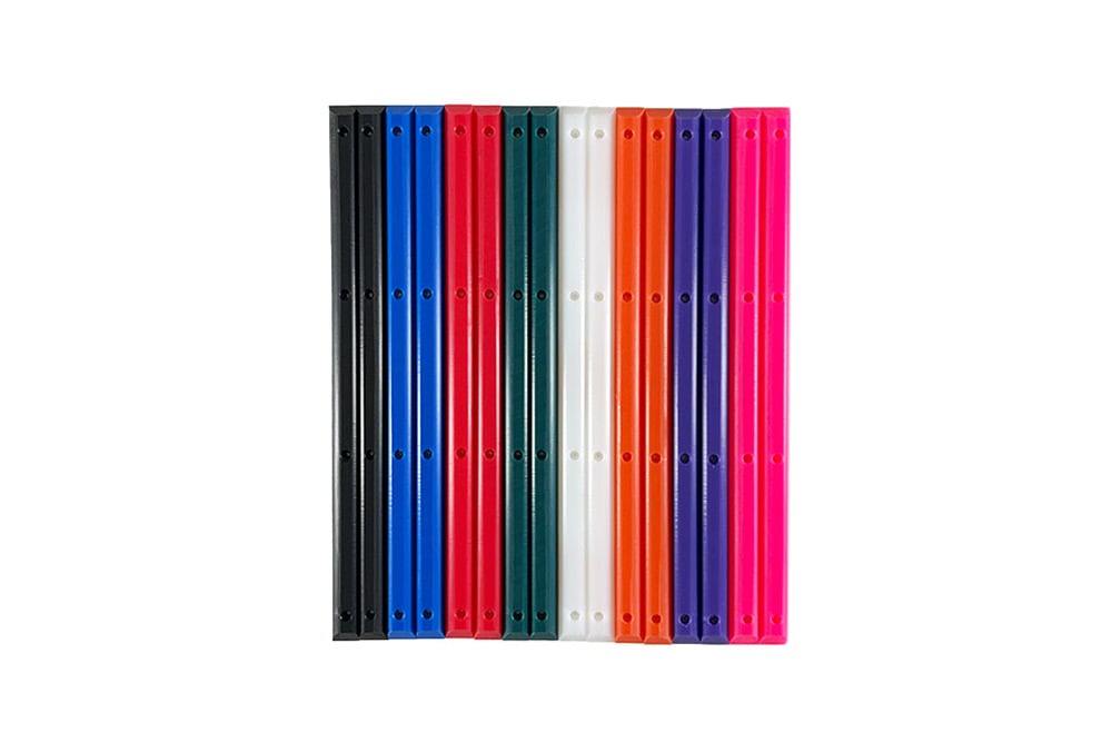 All rails are made in the USA. CNC-machined, using an extremely durable high molecular plastic that is made to slide and last. Most other skateboard rails on the market are injection molded which weakens the quality of the material. Mounting screws are provided as well as double stick tape on the backs of the rails to help with installation and minimize rattling.